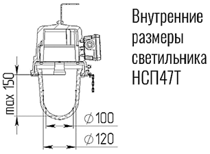 *Лампа накаливания, энергосберегающие лампы, светодиодные лампы и лампы типа ДРВ с цоколем Е27. Учитывая большое разнообразие выпускаемых энергосберегающих (КЛЛ) и светодиодных ламп при принятии решения об их использовании в светильниках типа НСП47Т- 75 УХЛ1 необходимо обращать внимание на внутренние размеры светильников. Не допускается касание лампы внутренних поверхностей светильника