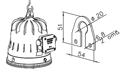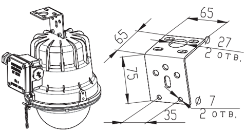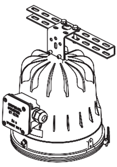 Описание базового варианта поставки - светильник поставляется с одним кабельным вводом и одной пробкой для тупикового монтажа, с универсальной скобой подвеса, без решётки и без отражателя.