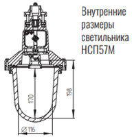 *Лампа накаливания, энергосберегающие лампы, светодиодные лампы и лампы типа ДРВ с цоколем Е27. Учитывая большое разнообразие выпускаемых энергосберегающих (КЛЛ) и светодиодных ламп при принятии решения об их использовании в светильниках типа НСП57М-200 УХЛ1 необходимо обращать внимание на внутренние размеры светильников.